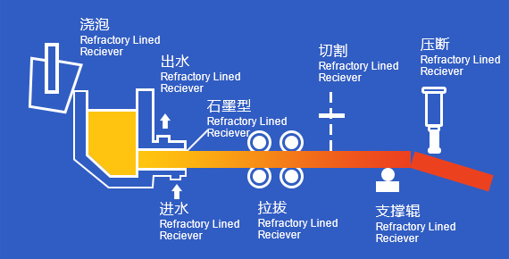 水平連鑄鑄鐵型材的制造方法是將嚴格選擇的原輔料經沖天爐或感應爐熔化處理后的鐵水,倒入保濕爐內,鐵水流入安裝在保溫爐下方的冷水石墨結晶器中,凝固成一定強度的外殼,被牽引機拉拔成型材。保溫爐內的熔融鐵水,在牽引機拉拔的同時,又不斷地補充到結晶器內冷卻凝固,形成一個動態的大冒口補縮小鑄件的工藝模式,保證了所產棒坯致密,無內部缺陷。不同形狀的結晶器和不同的生產工藝,可以生產不同截面,不同材質的鑄型材。
